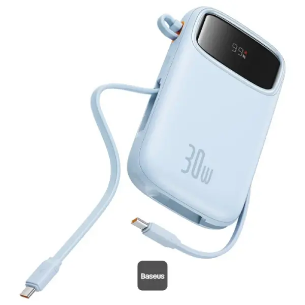 PowerBank à charge rapide Baseus QPow 2 – 10000mAh – 30W – 2 câbles Type-C intégrés – Indicateur LED numérique pour suivre le niveau de batterie – Bleu – P10055008313-00