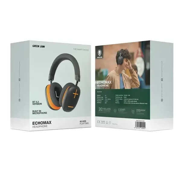 Casque EchoMax avec microphone intégré Green Lion – 48H d’autonomie – BT 5.3 – Portée maximale 10m – Noir/Orange – GNECOMAXOGBK