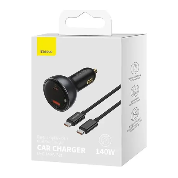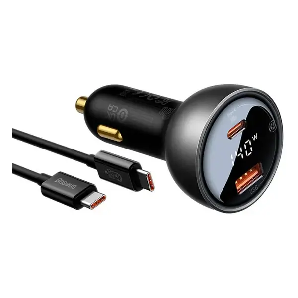 Votre téléphone ou ordinateur portable est déchargé pendant un voyage ? Ce n’est plus un problème ! Le chargeur de voiture Baseus est équipé de 2 ports – USB-C et USB – vous permettant de recharger rapidement jusqu’à 2 appareils en même temps ! Sa puissance maximale atteint 140 watts. Le produit est compatible avec la plupart des véhicules de 12 V à 24 V, et grâce aux technologies intégrées, il garantit une utilisation en toute sécurité. Le chargeur est également doté d’un écran numérique pratique.