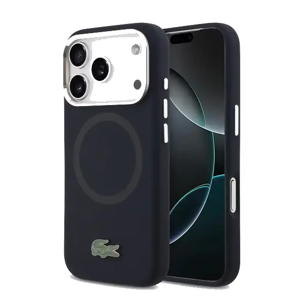 Coque de téléphone en silicone avec logo métallique Lacoste pour iPhone 17 Pro Max – MagSafe – Protection contre les chutes et autres dommages – Navy – LCHMP17XSLAV