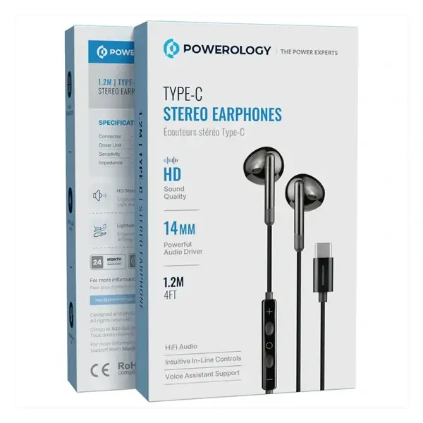 Écouteur filaire stéréo Powerology – Type-C – 1,2m – Qualité sonore HD Haut-parleur audio puissant – Commande de volume intégré – Basse profonde – PWEPHCR17BK