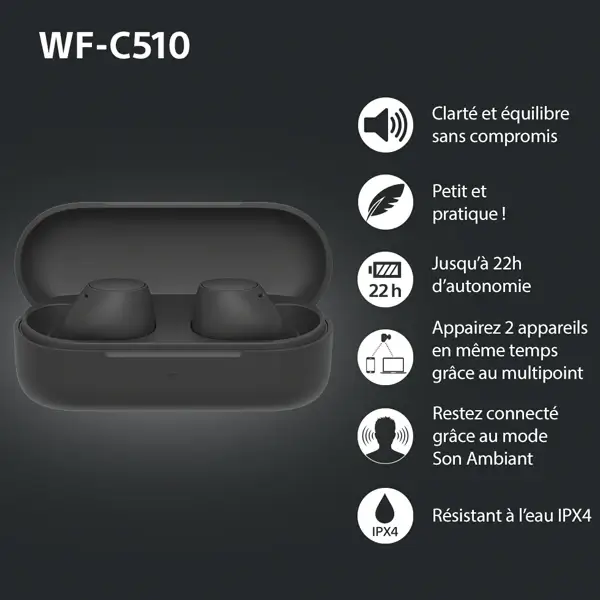 Équipés de la connexion multipoint, du mode Ambient Sound et d’une fonction d’égaliseur personnalisée, les WF-C510 sont parfaits pour une utilisation quotidienne et offrent une expérience d’écoute plus riche.