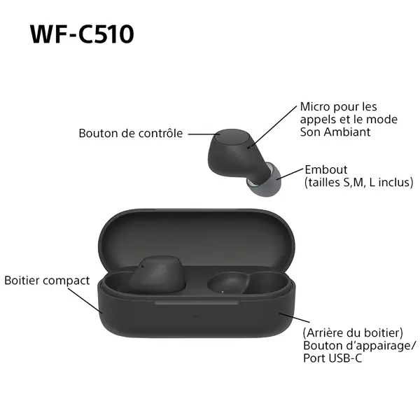 Écouteurs sans fil Sony WF-C510 – 11h d’autonomie plus 11h encore avec l’étui de charge – BT – Connexion multipoint – Basses puissantes – Noir