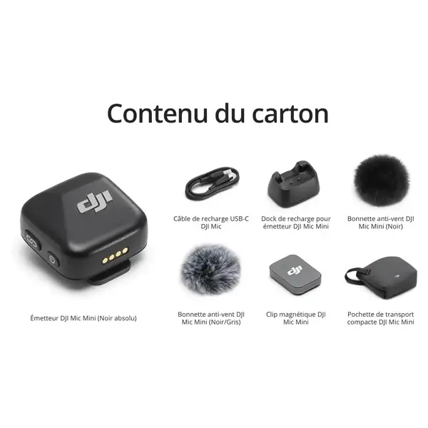 Micro cravate sans fil DJI Mic Mini – 1 micro – 1TX + 1RX – Bluetooth – rechargeable – Portée 400m – 8h d’autonomie – Annulation active du bruit – Boitier de recharge – Connecteur Type-C
