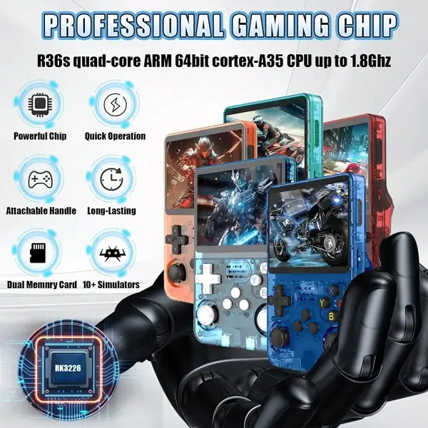 La OLA Game Pocket est une console rétro portable puissante équipée d’un écran IPS 3,5″ HD (640×480), d’un processeur Quad-Core ARM Cortex-A7 1.5GHz, et d’une double entrée pour cartes TF jusqu’à 256 Go. Elle prend en charge plus de 10 émulateurs classiques (PSP, N64, PS1, GBA, etc.), offrant plus de 3 heures d’autonomie grâce à sa batterie 3500 mAh.
