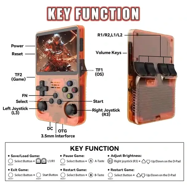Côté jouabilité, la console est équipée de deux joysticks analogiques, d’un D-Pad, de boutons réactifs, et de gâchettes L1/L2/R1/R2, offrant un confort de jeu digne d’une manette moderne. Les touches combinées permettent aussi d’ajuster la luminosité, sauvegarder/charger vos parties, ou redémarrer rapidement vos jeux.
