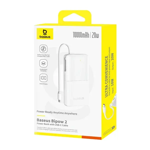 PowerBank à charge rapide Baseus Bipow 2 – 10000mAh – 20W – 1 câble type-c intégré – 1 support USB et 1 support type-c – Indicateur LED numérique pour suivre le niveau de batterie – Blanc – P10077101213-00
