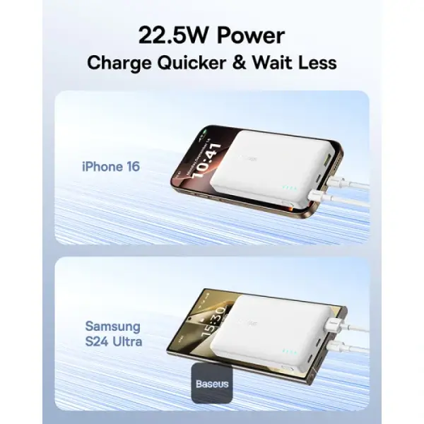 Charge rapide PD + QC 22,5 W Rechargez votre iPhone 16 ou Galaxy S25 à 50 % en 30 minutes ou moins.