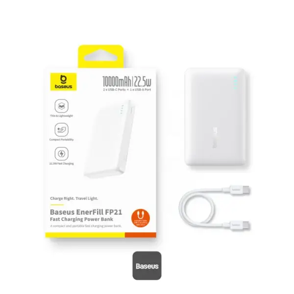 PowerBank à charge rapide Baseus EnerFill FP21 – 10000mAh – 22,5W – 1 support USB et 2 supports type-c – Indicateur lumineux pour suivre le niveau de batterie – Blanc – P1008210D213-00