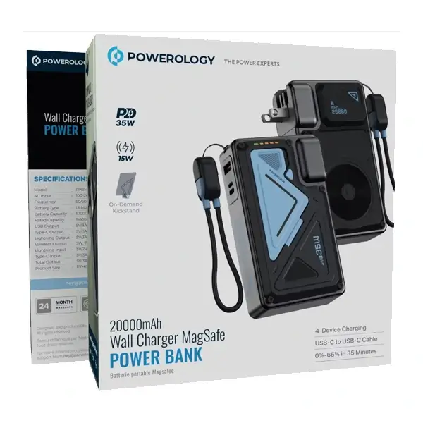 Powerbank avec option chargeur mural et MagSafe intégré Powerology - 20 000mAh - Protection contre la surchauffe - Capacité de charge de 4 appareils simultanément - Support pliable intégré - PPBMH104WH
