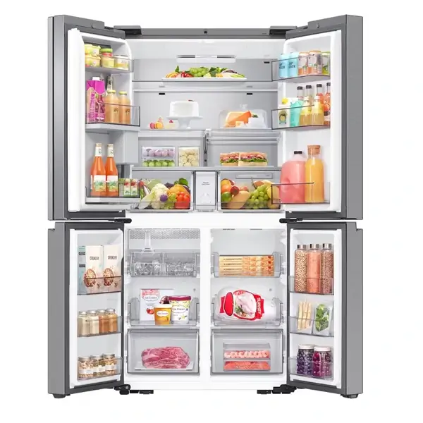 *Une lumière rouge s’allume sur la caméra lorsqu’elle est active. L’utilisateur peut apparaître sur l’image avec l’aliment mais le reste sera flouté. **A partir de mars 2024, AI Vision Inside peut identifier 33 aliments tels que les fruits et légumes. Si l’aliment n’est pas reconnu, il se peut qu’il soit listé comme “”produit inconnu”. AI Vision Inside ne peut identifier ou lister les produits rangés dans les portes ou le congélateur. AI Vision Inside apprend en se basant sur des modèles d’apprentissage en profondeur, qui peuvent être mis à jour de façon périodique afin d’améliorer sa précision. ***L’utilisateur aura peut-être besoin de lister les aliments manuellement pour plus de précision. Connexion WiFi et compte Samsung requis.